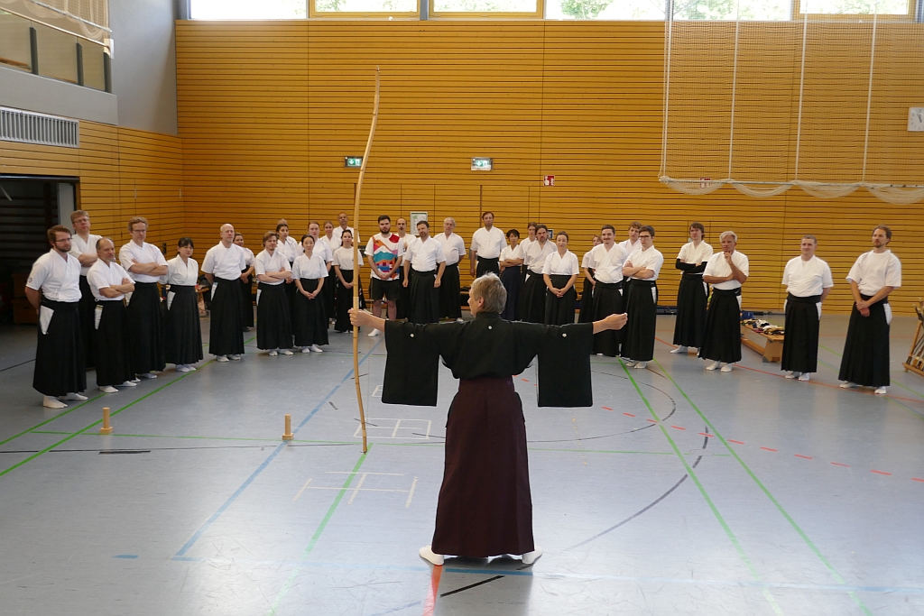 Eröffnet wurde der Lehrgang mit einem Mochi Mato Sharei. Unterstützung bekamen die drei Prüfer hierbei von Susanne (Beisitzerin) und Stefan (Teilnehmer). Nach dem üblichen Vorschießen der Teilnehmer wurde dann in 2 Mato- und einer Makiwara-Gruppe geübt. Unterbrochen wurde der praktische Teil von einem Info-Block, in dem Lilo auf die Prüfungskriterien für die anstehende Prüfung einging. Auch wurde das korrekte Verhalten bei Shitsu (heruntergefallener Pfeil, gerissene Sehne) erläutert und demonstriert. Für die Anwärter zum 1. Kyu fand dann die schriftliche Prüfung statt, bei der drei Fragen zu beantworten waren. Der Abend klang bei einem gemeinsamen Besuch im Biergarten aus.