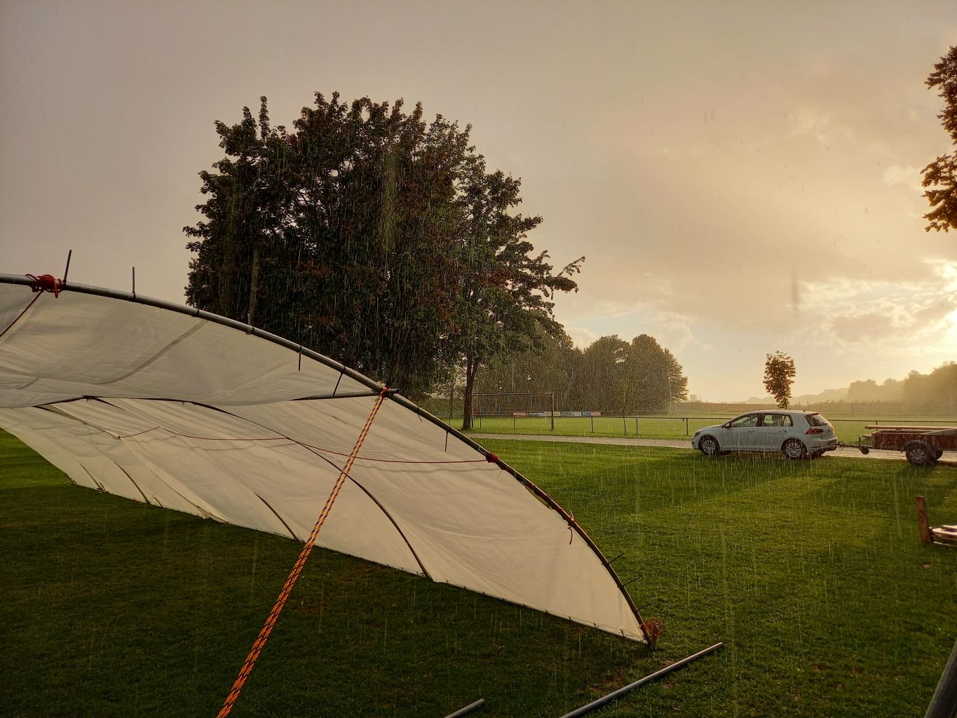 Bereits am Freitag während des Aufbaus zog der ein oder andere Regenschauer über den Sportplatz der Spielvereinigung Joshofen Bergheim. Der anschließende Sonnenschein zauberte aber traumhafte Regenbogen an den Himmel. So konnte der Platz mit der Unterstützung vieler Helfer aus Neuburg und Ingolstadt mit einigen Unterbrechungen für die anstehenden Enteki-Meisterschaften vorbereitet werden. Neben dem bekannten Enteki-Zelt des DKyuB wurde ein weiteres Zelt, in dem Bögen, Pfeile und sonstiges Material regensicher abgelegt werden konnten, aufgebaut.