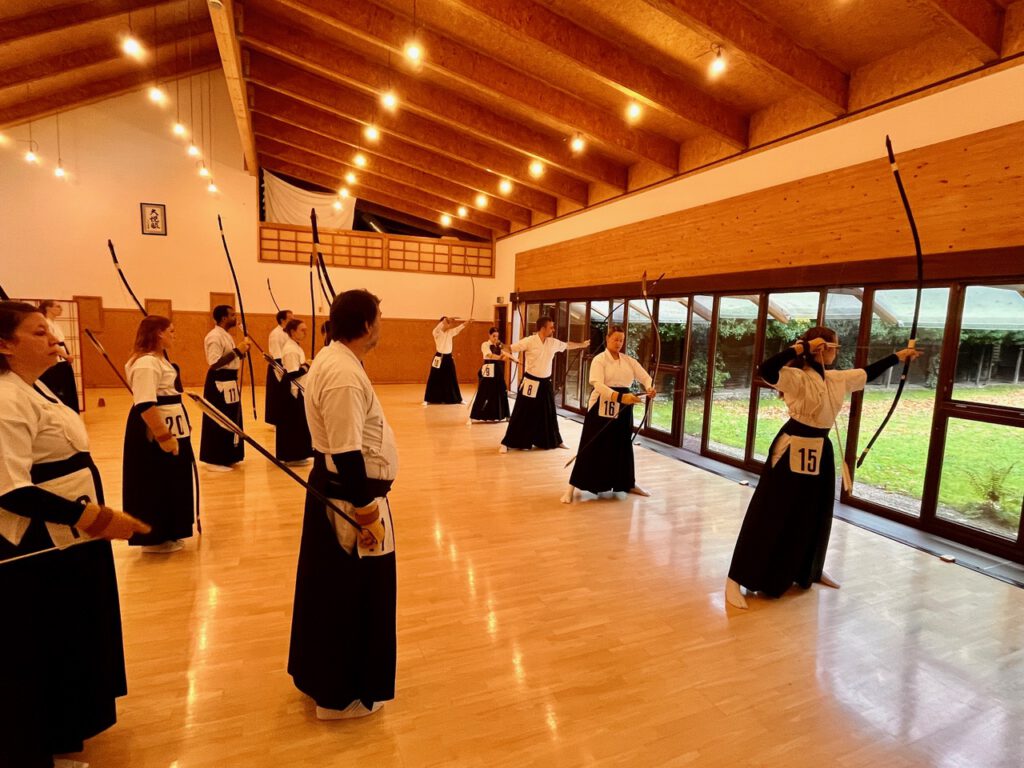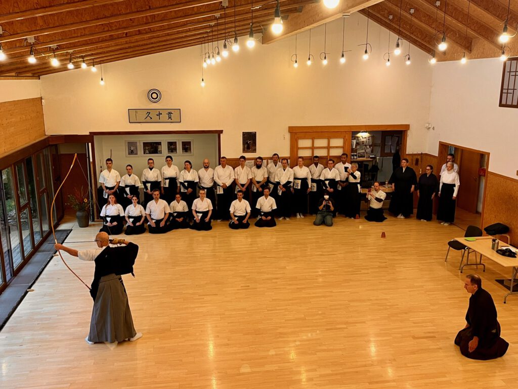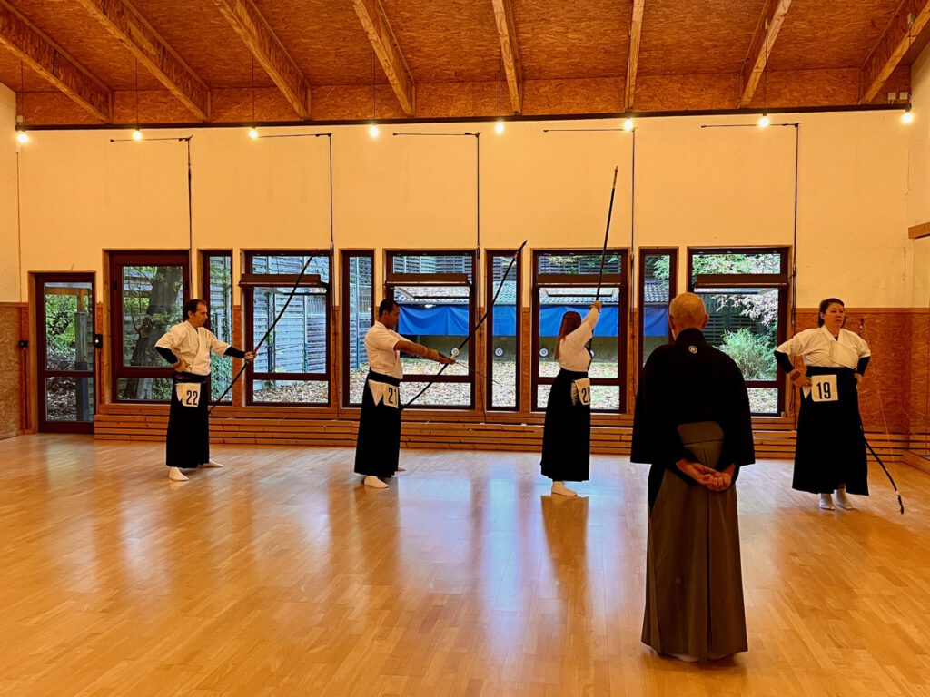 Nach Abschluss des Wettkampfes folgte ein weiteres Mini-Seminar zur Schießtechnik-Optimierung, das in denselben Gruppen und mit denselben Übungsleitern wie am Vortag durchgeführt wurde. Der Schwerpunkt lag auf der korrekten Kräfteverteilung beim Hikiwake und Yugamae. Die Hassetsu wurden dazu rückwärts durchlaufen, um zu verdeutlichen, was mit jedem vorhergehenden Schritt für den folgenden erreicht werden soll und damit wie die einzelnen Phasen des Schießablaufs aufeinander aufbauen. Anschließend wurde das Gelernte praktisch umgesetzt: Zunächst durfte jeder Teilnehmer vor den Übungsleitern vorschießen, um individuelle Korrekturen zu erhalten. Der wartende Schütze dahinter achtete dann bei den folgenden Pfeilen auf die korrekte Ausführung der Verbesserungen. Feliks Hoff fasste den Weg zum Verständnis und zur Verinnerlichung von Technik und Taihai mit „drei Grundprinzipien” zusammen: „Üben, üben – und noch mehr üben.“